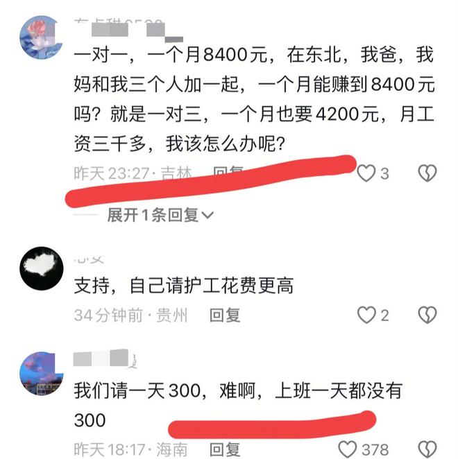 正常护工一天是240-450元左右(一对三),再便宜的一天也要80-120元(一对十)。